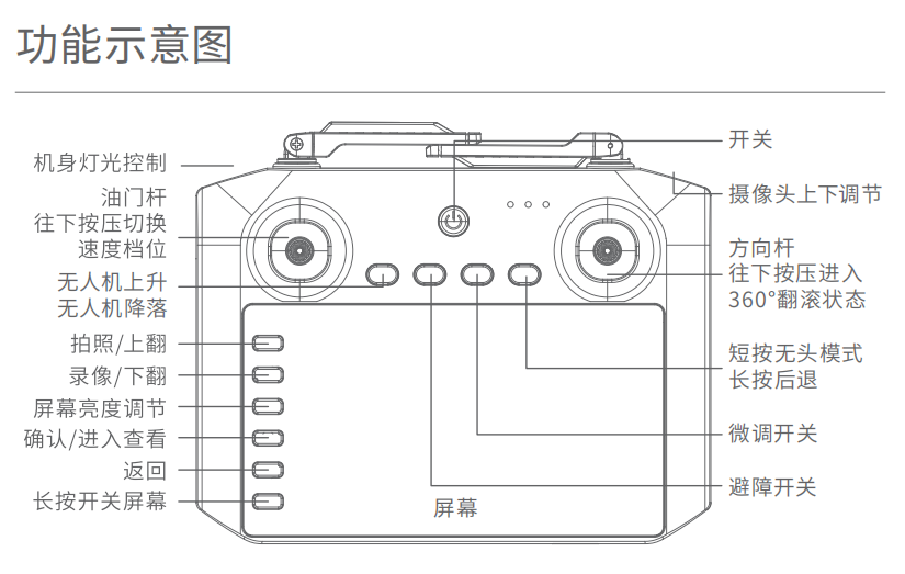 温馨提示:初次飞行前建议熟悉所有按键功能,并在低高度下练习,以避免误操作导致无人机失控。